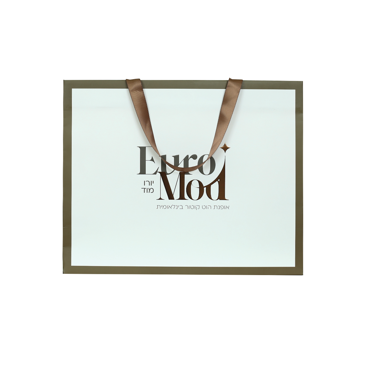 שקית קרטון מיוחדת עם הבלטה ללוגו, ידיות סאטן פנימיות לנראות נקיה
