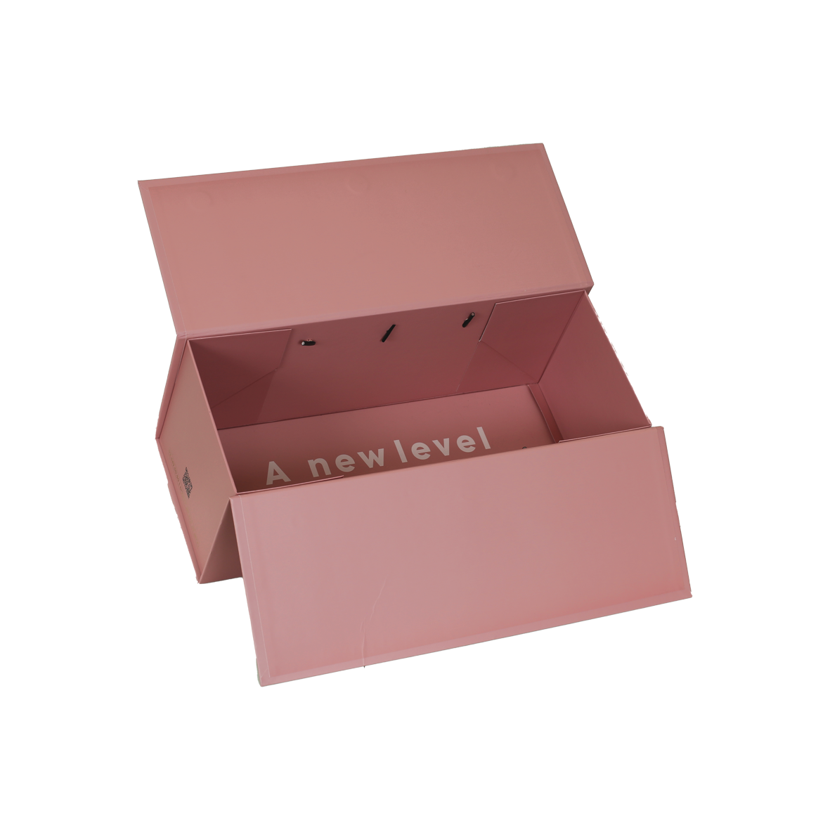 קופסא מתקפלת לפאה עם ידיות סאטן ממותגות , לוגו בפויל זהב מובלט והדפסה פנימית