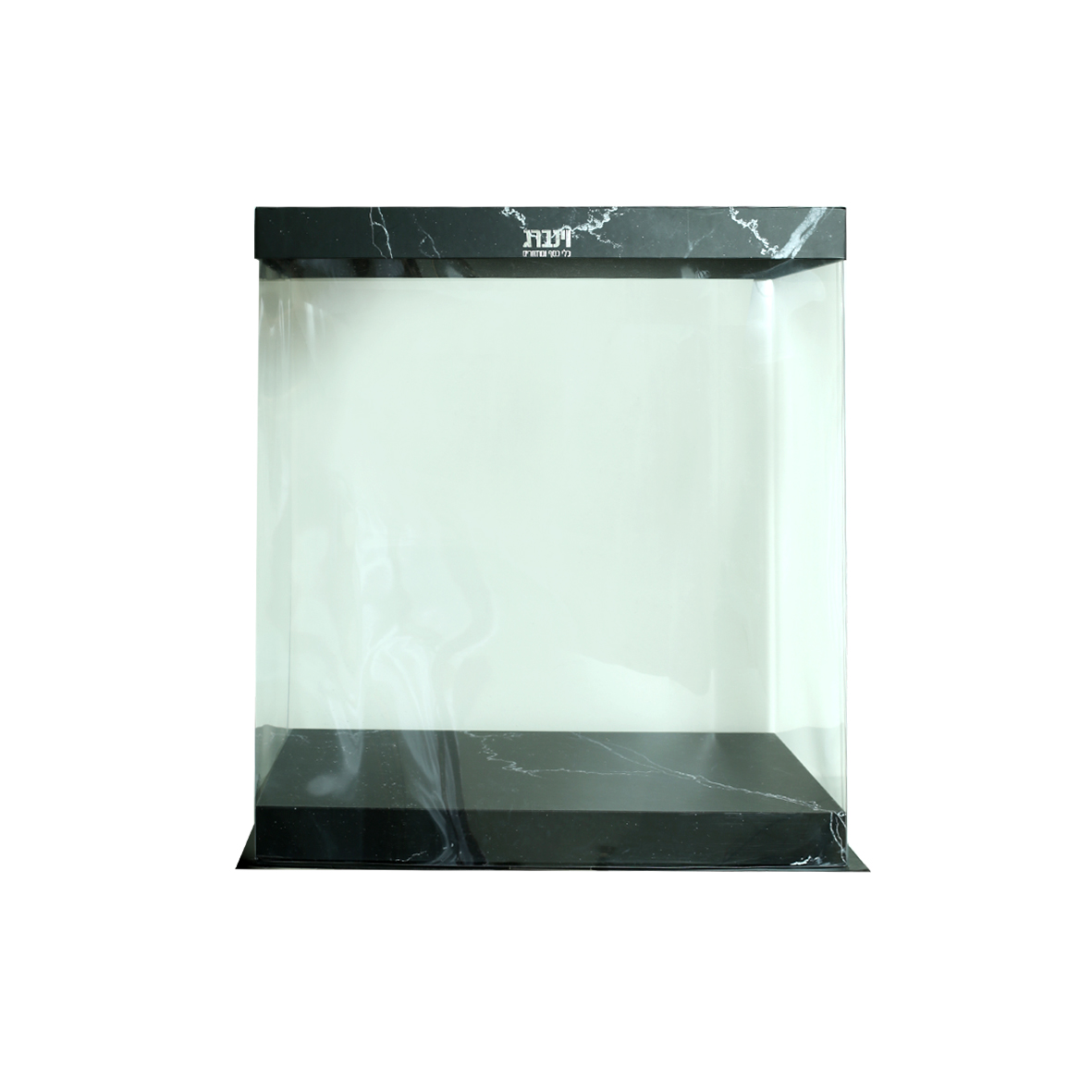 קופסא מיוחדת לעיצובי מתנה /כלי כסף מבסיס ומכסה עשויים קרטון קשיח ושקף pvc בינהם עם לוגו בהטבעת כסף מובלטת