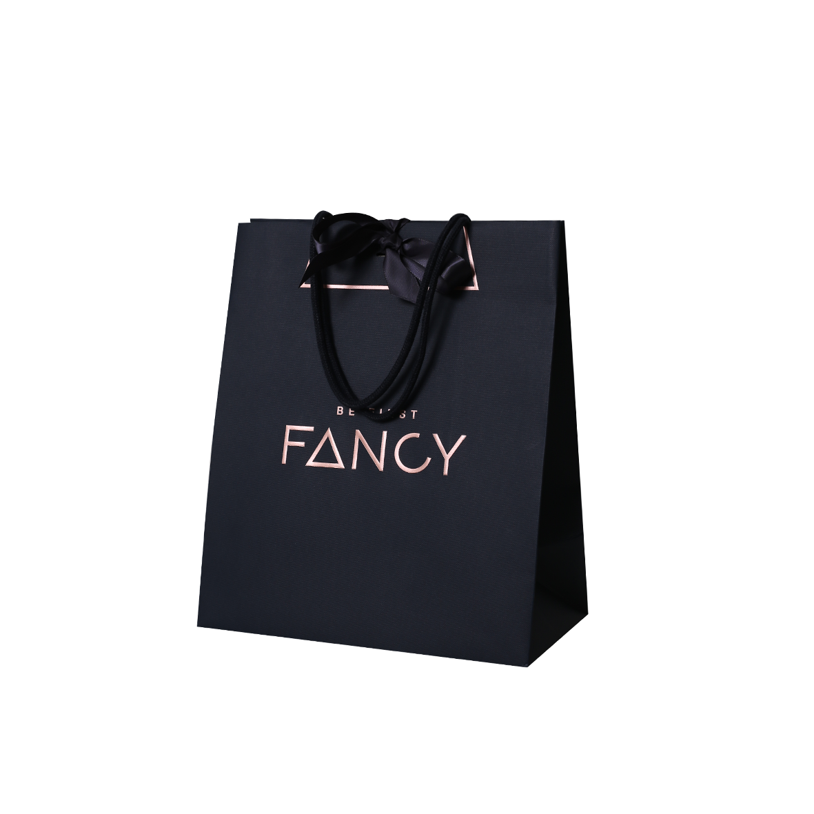 שקית קרטון בגימור מיוחד של טקסטורה לנייר, הטבעה ללוגו , ידיות חבל פנימיות וסרט קשירה