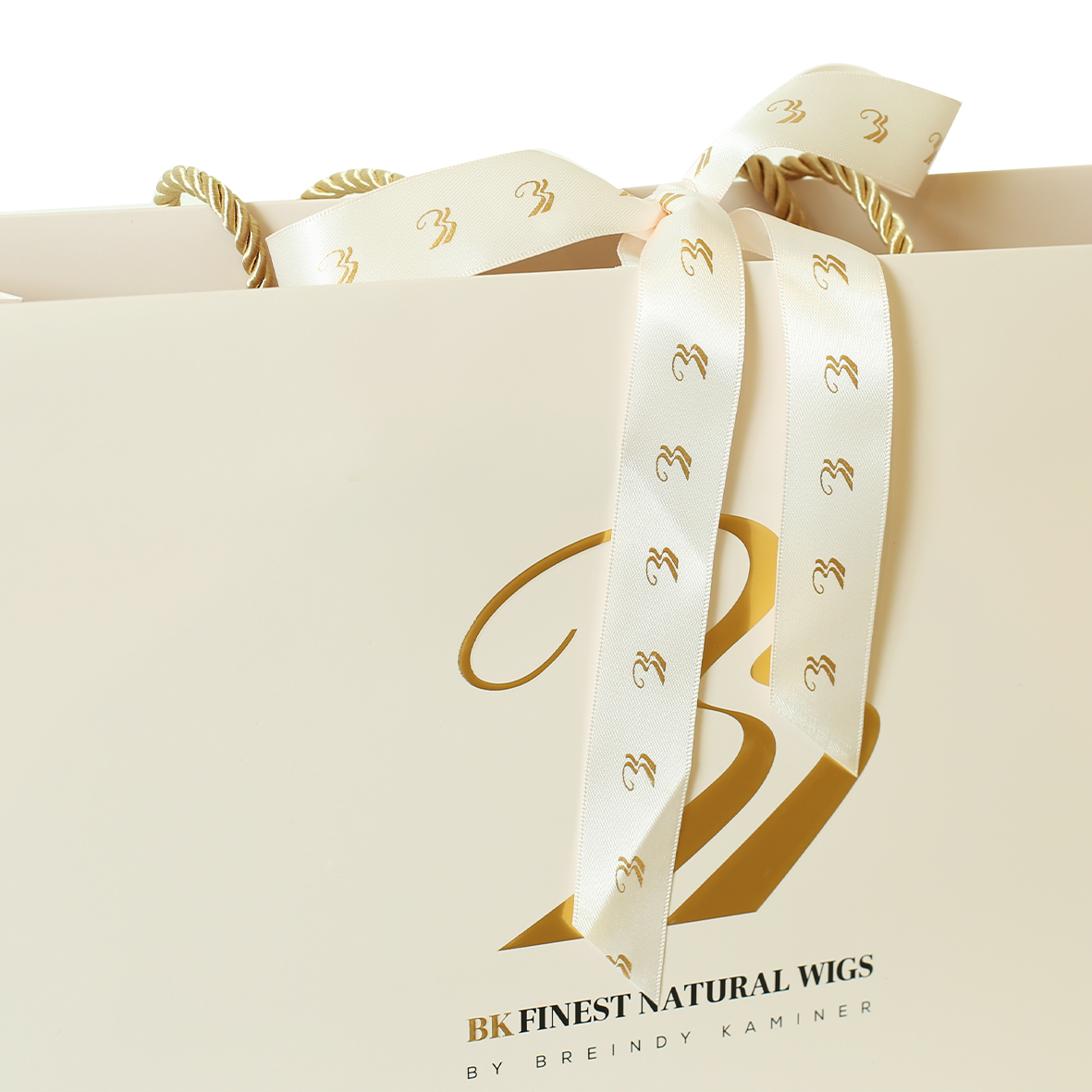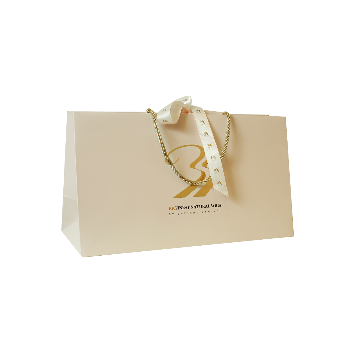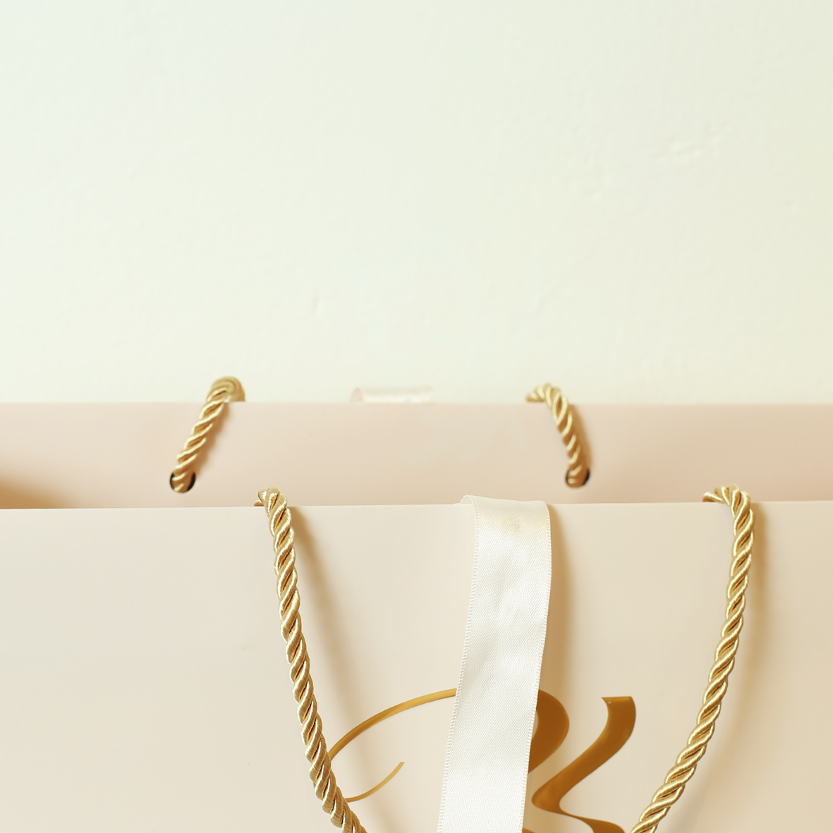 שקית בהדפסת למינציה מט ולוגו בהטבעה מובלטת  ,ידיות חבל  זהב וסרט קשירה ממותג